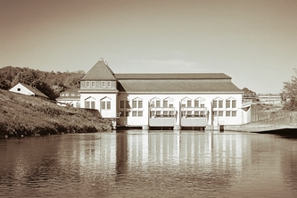 Pumpwerk Westhofen Von den frühen Anfängen der Nutzung des Wassers und der Wasserkraft im Ruhrtal zeugt heute noch die Wasserkraftanlage und Pumpstation in Westhofen, die seit 1922 nahezu unverändert in Betrieb ist. Die Ruhr wird hier mit einer kompletten Wehranlage angestaut, die über insgesamt sechs Wehrfelder aufgebaut ist. Bis 2010 wandelte das Laufwasserkraftwerk in Westhofen die Energie aus der fließenden etwa fünf Meter hohen Welle der Ruhr mit vier Francis-Turbinen direkt in mechanische Energie für Kolbenpumpen um, die Trinkwasser in das Versorgungsnetz pumpten. Aufgrund des sinkenden Trinkwasserbedarfs im Ruhrgebiet entschieden sich die Wasserwerke Westfalen für den Umbau der Wasserkraftanlage am Westhofener Wehr zum Kraftwerk. Die vier Francis-Turbinen aus dem Jahr 1922 wurden durch zwei Kaplan-Turbinen ersetzt, die der Stromerzeugung dienen und seit 2012 knapp sechs Millionen Kilowattstunden pro Jahr erzeugen. Das Gebäude steht unter Denkmalschutz. |